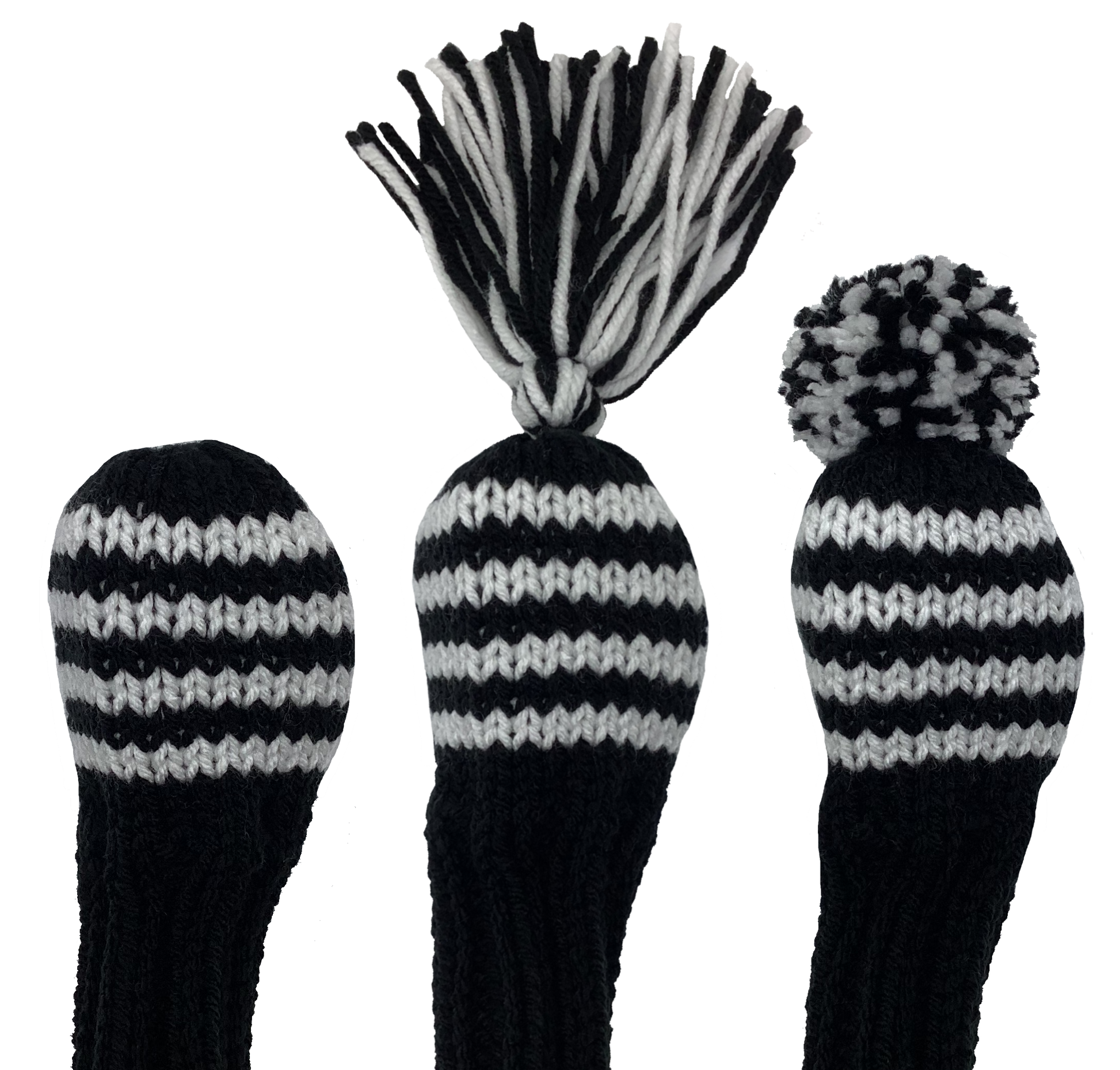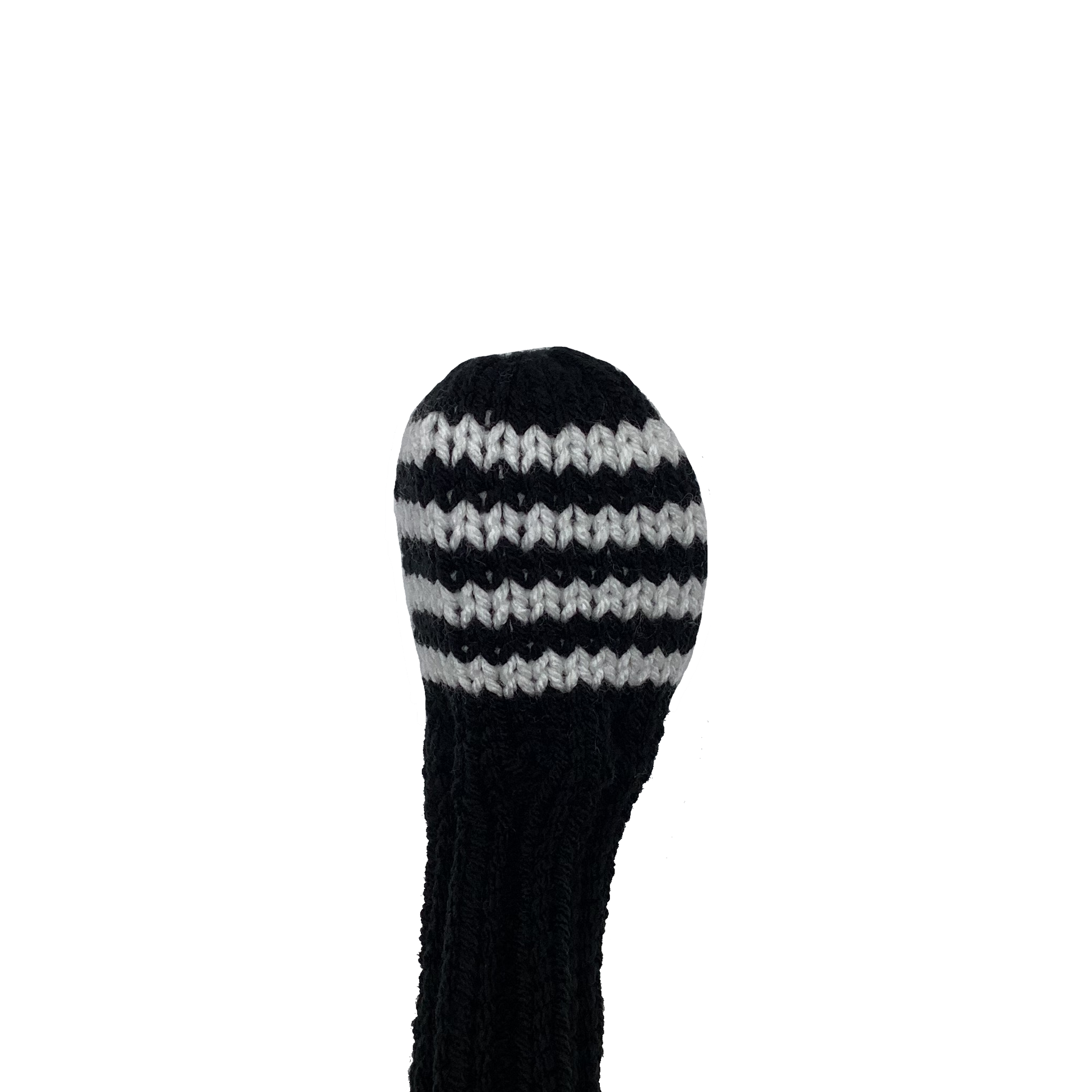 Classic style hybrid headcover in black with four white stripes and a 6" shaft portion. Choose topper style: none, tassel or pom-pom.
