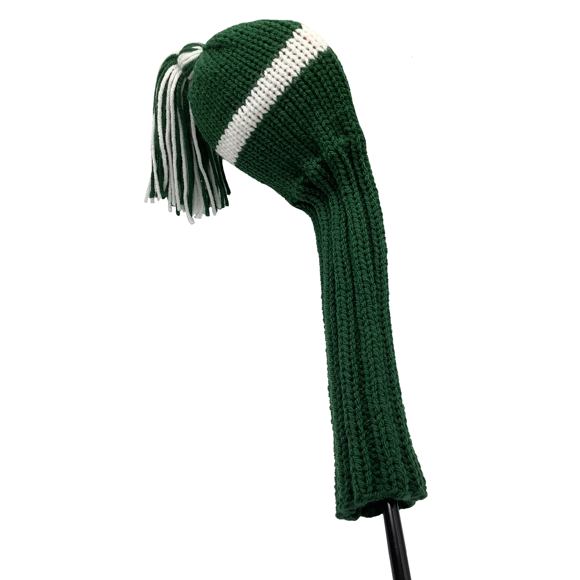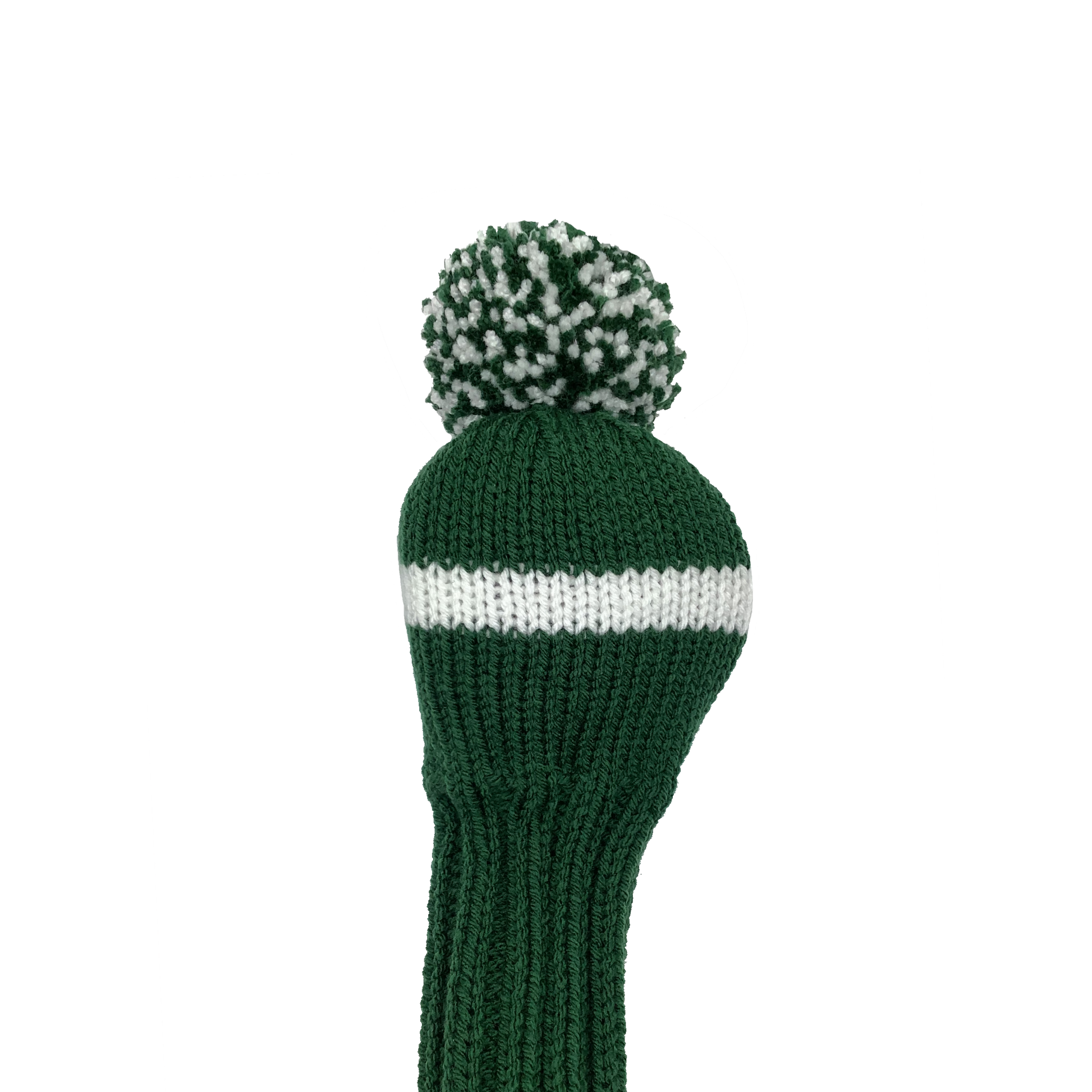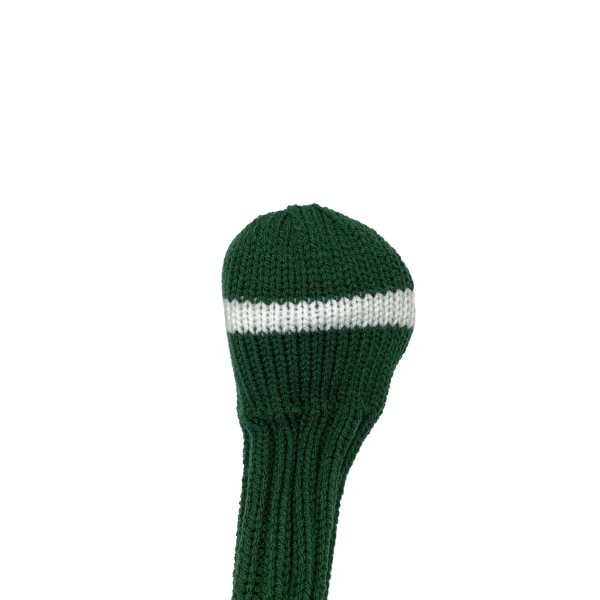 Classic style driver headcover in forest green with one wide white stripe and a 10" shaft portion. Choose topper style: none, tassel or pom-pom.