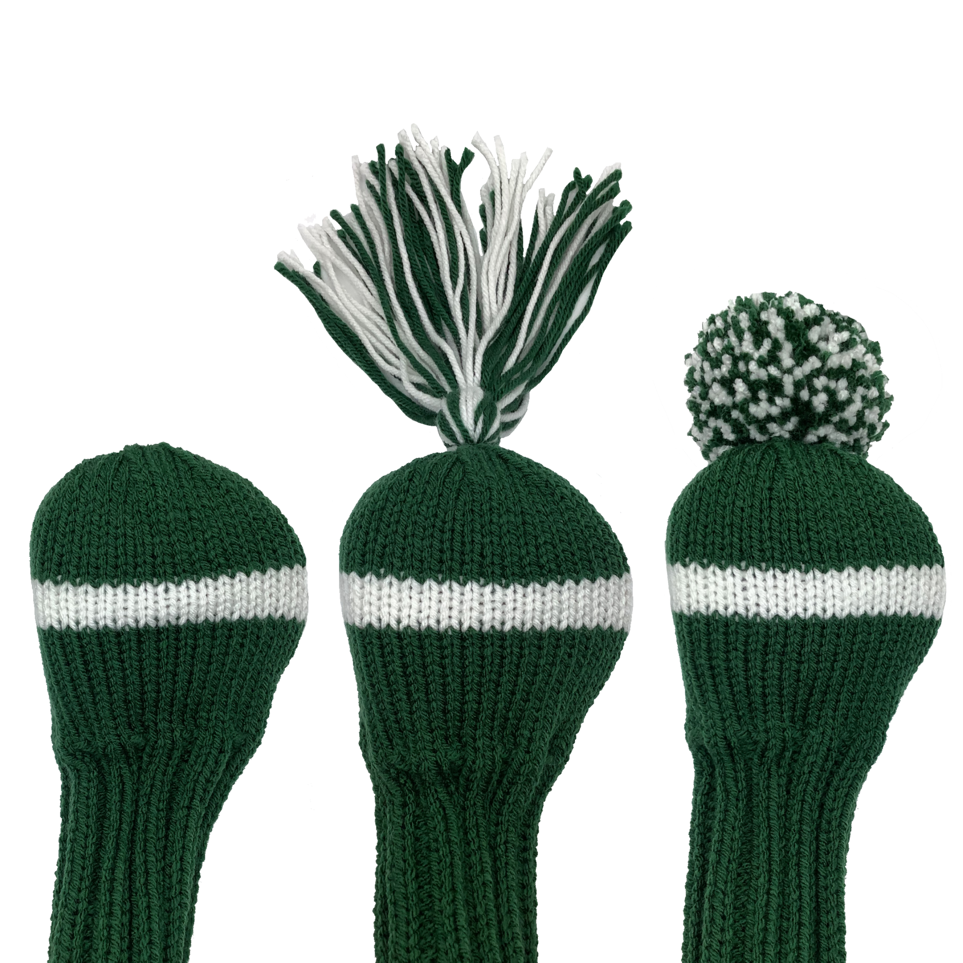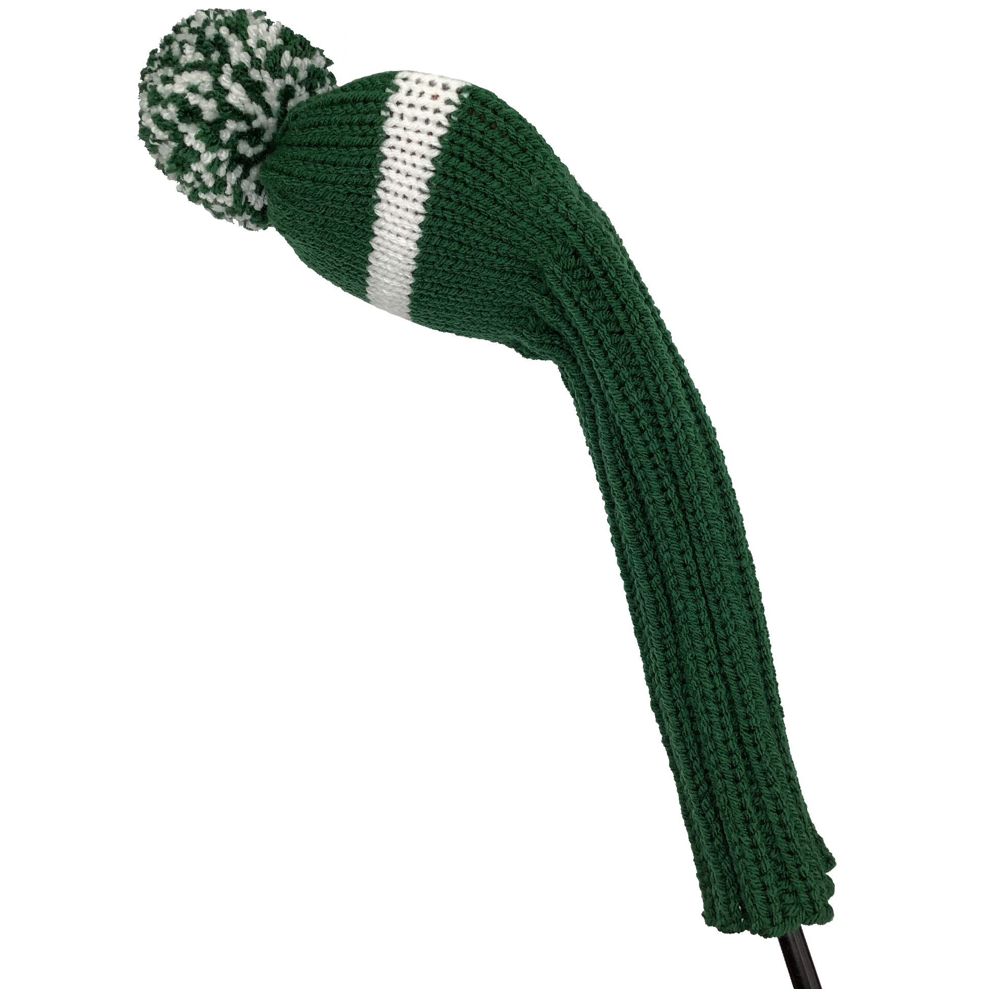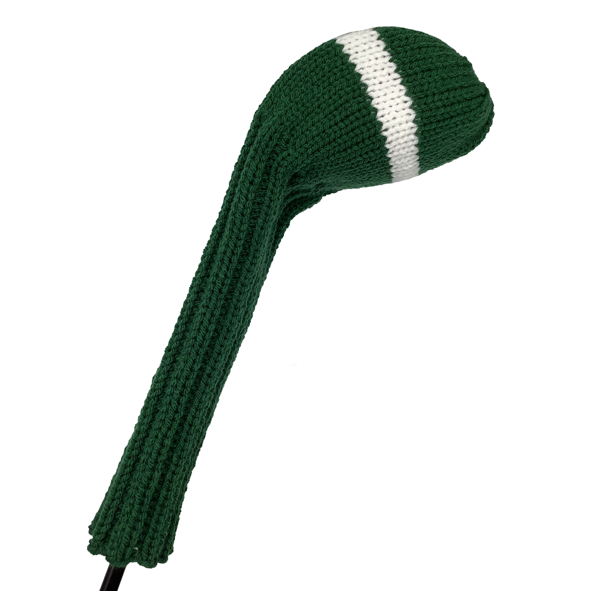 Classic style driver headcover in forest green with one wide white stripe and a 10" shaft portion. Choose topper style: none, tassel or pom-pom.