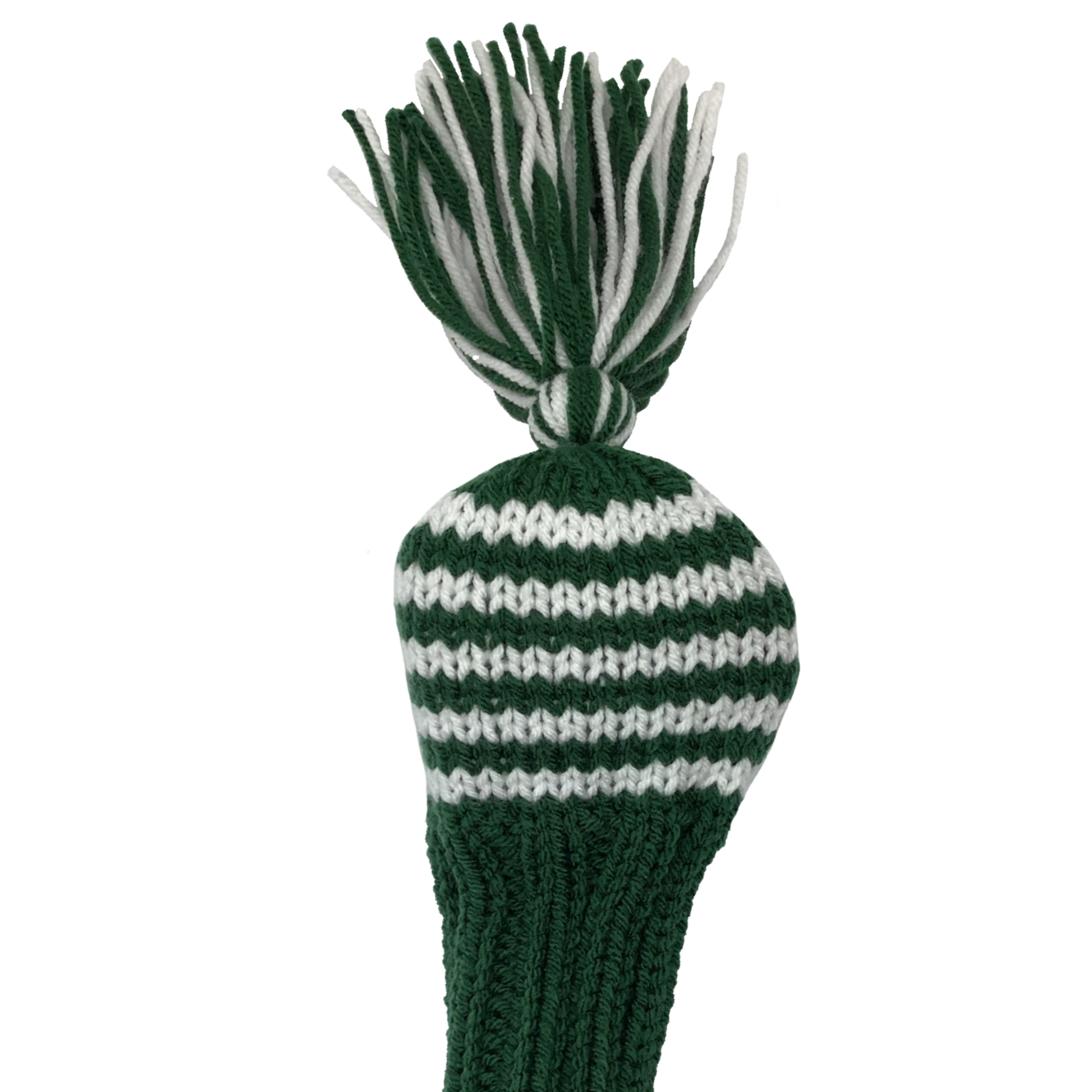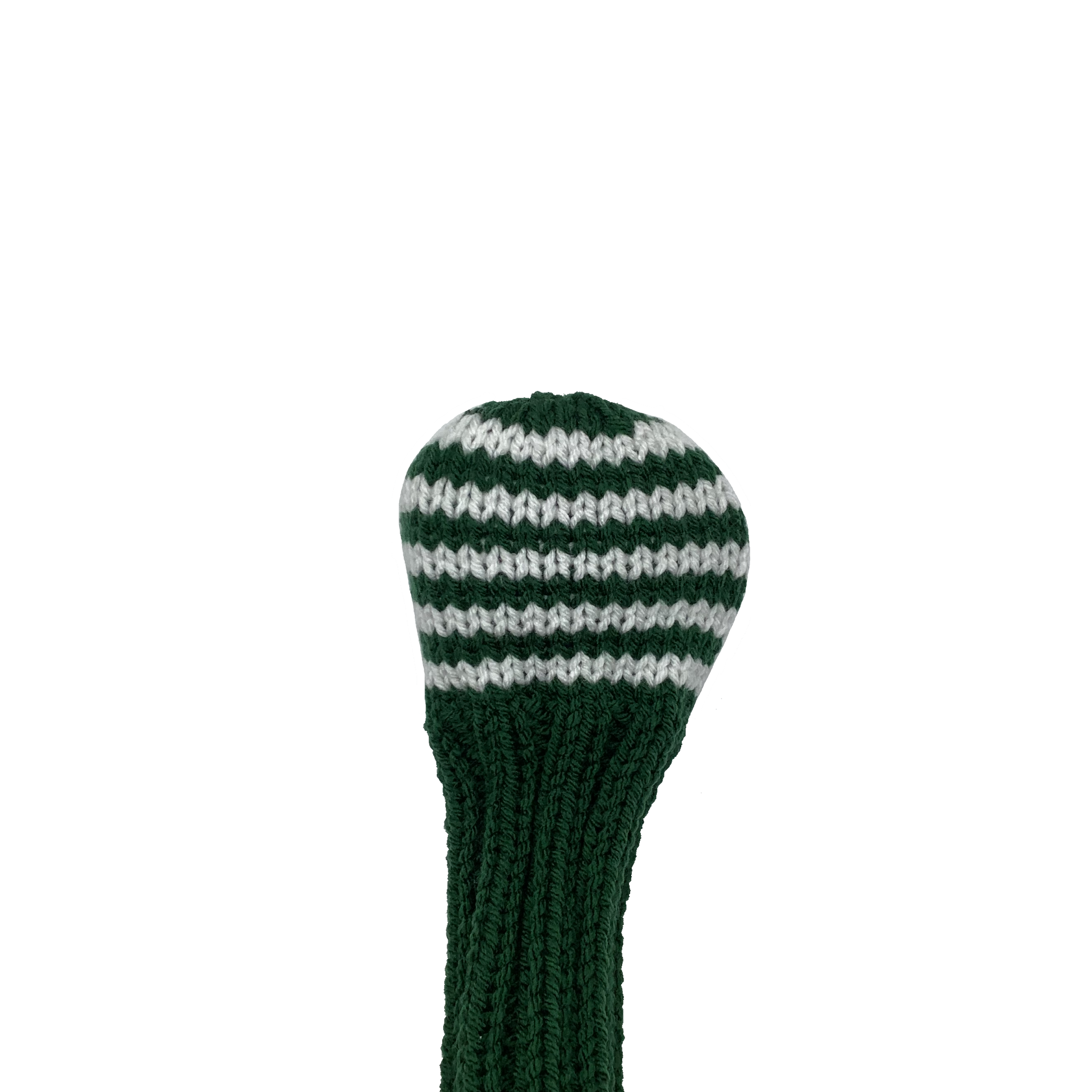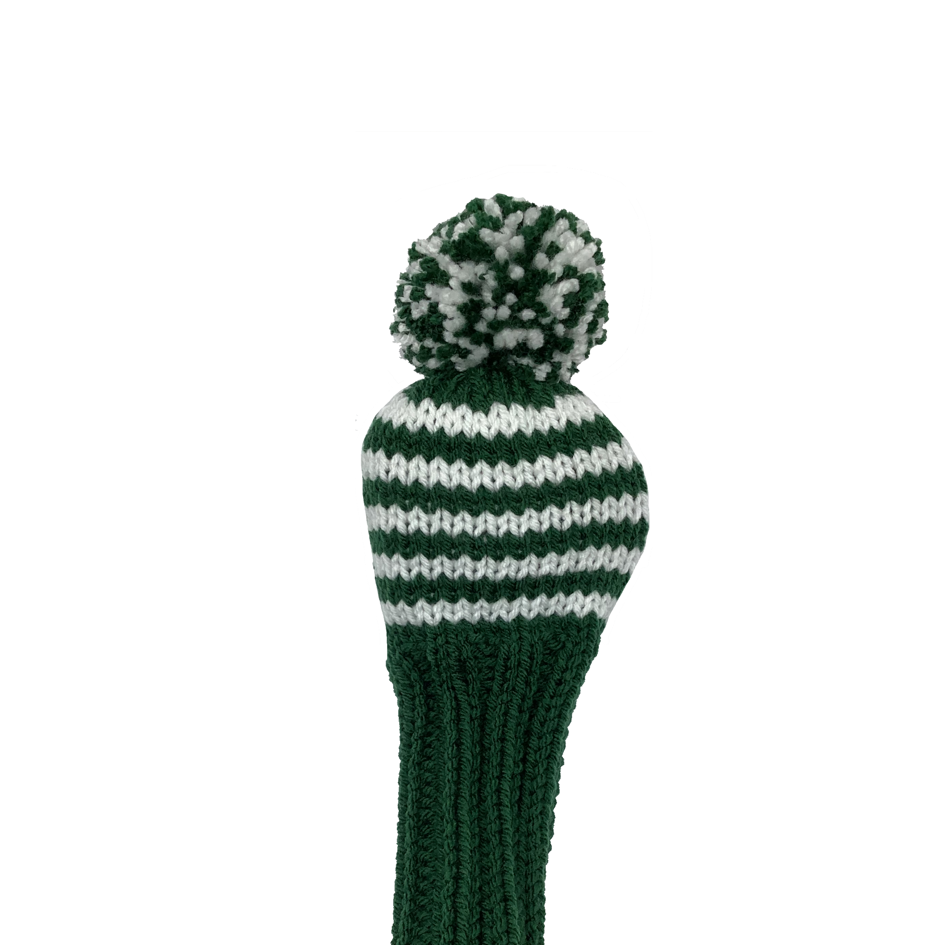 Classic style fairway wood headcover in forest green with five white stripes and an 8" shaft portion. Choose topper style: none, tassel or pom-pom.