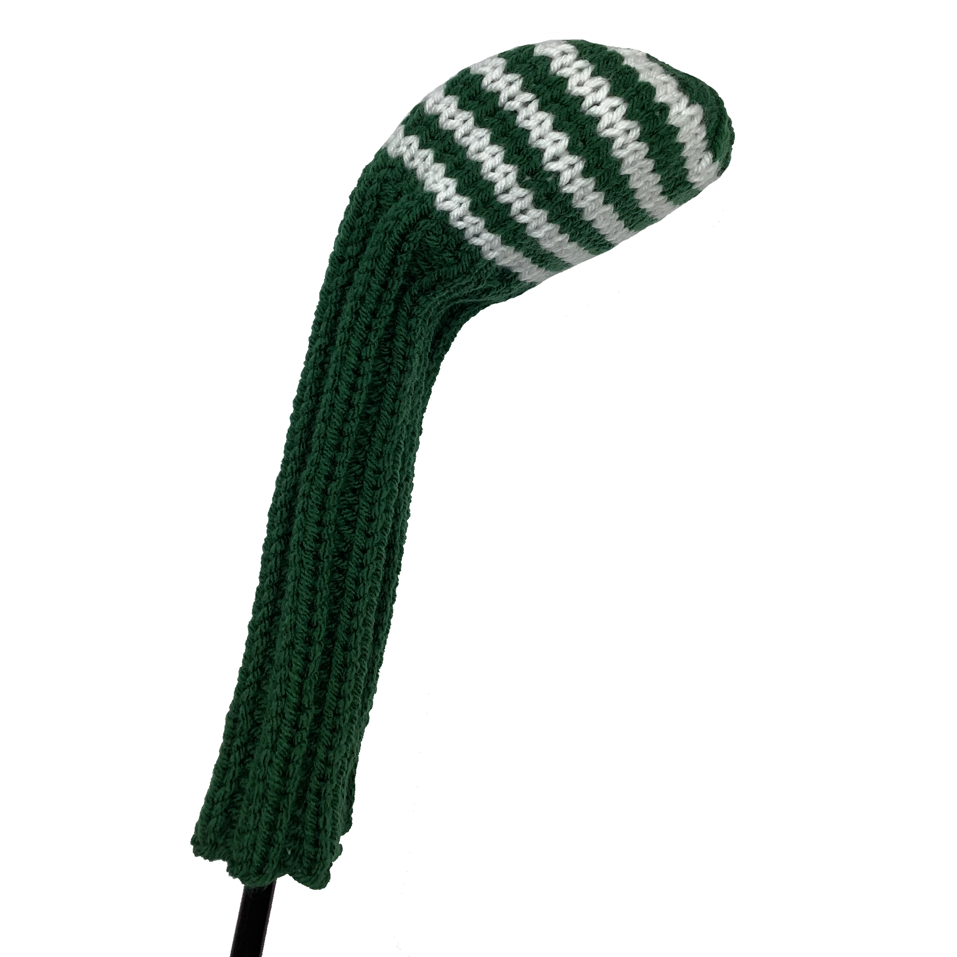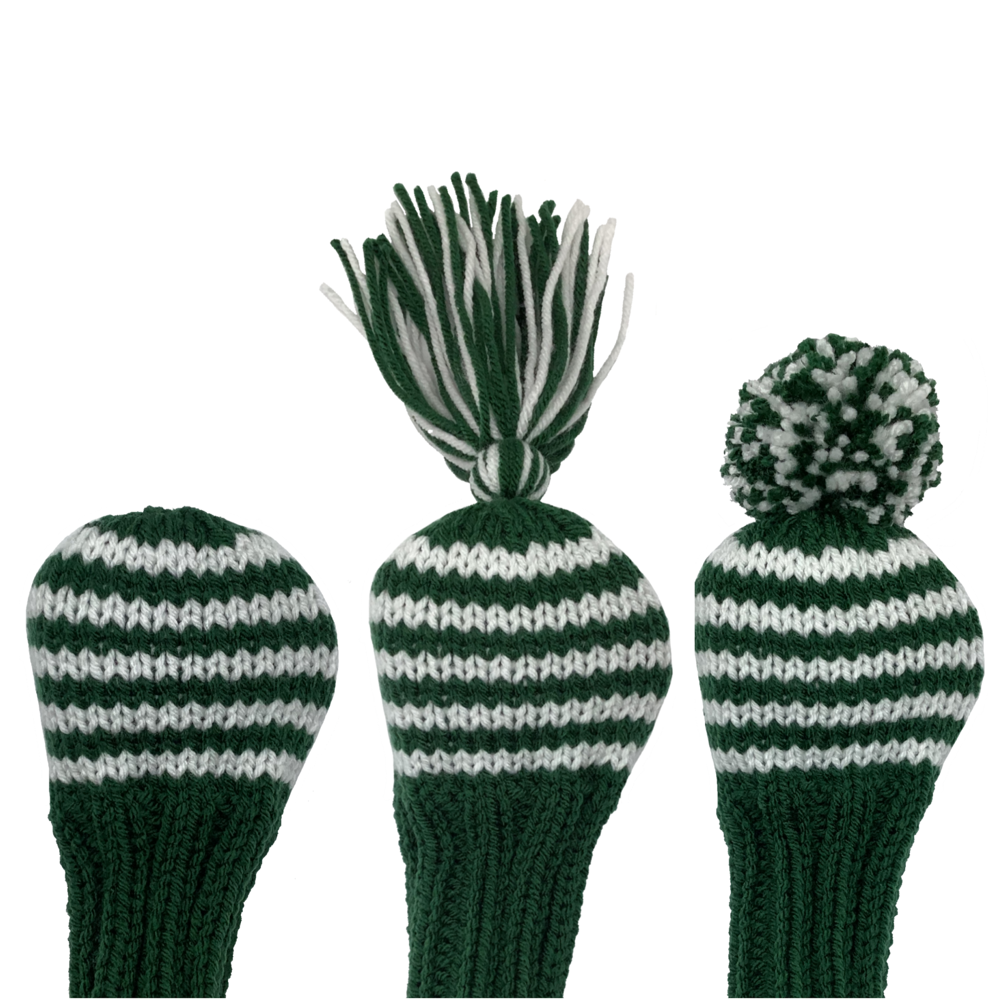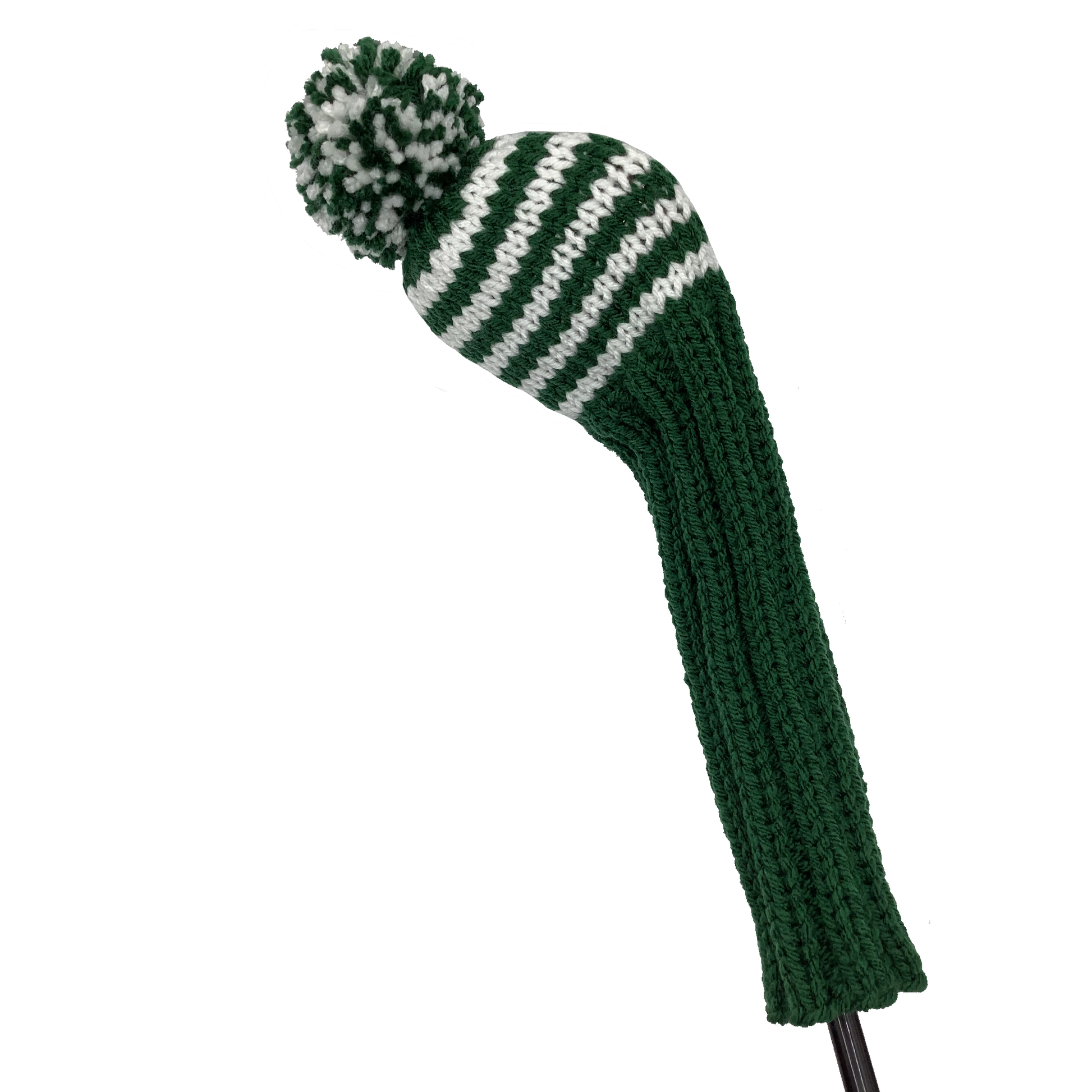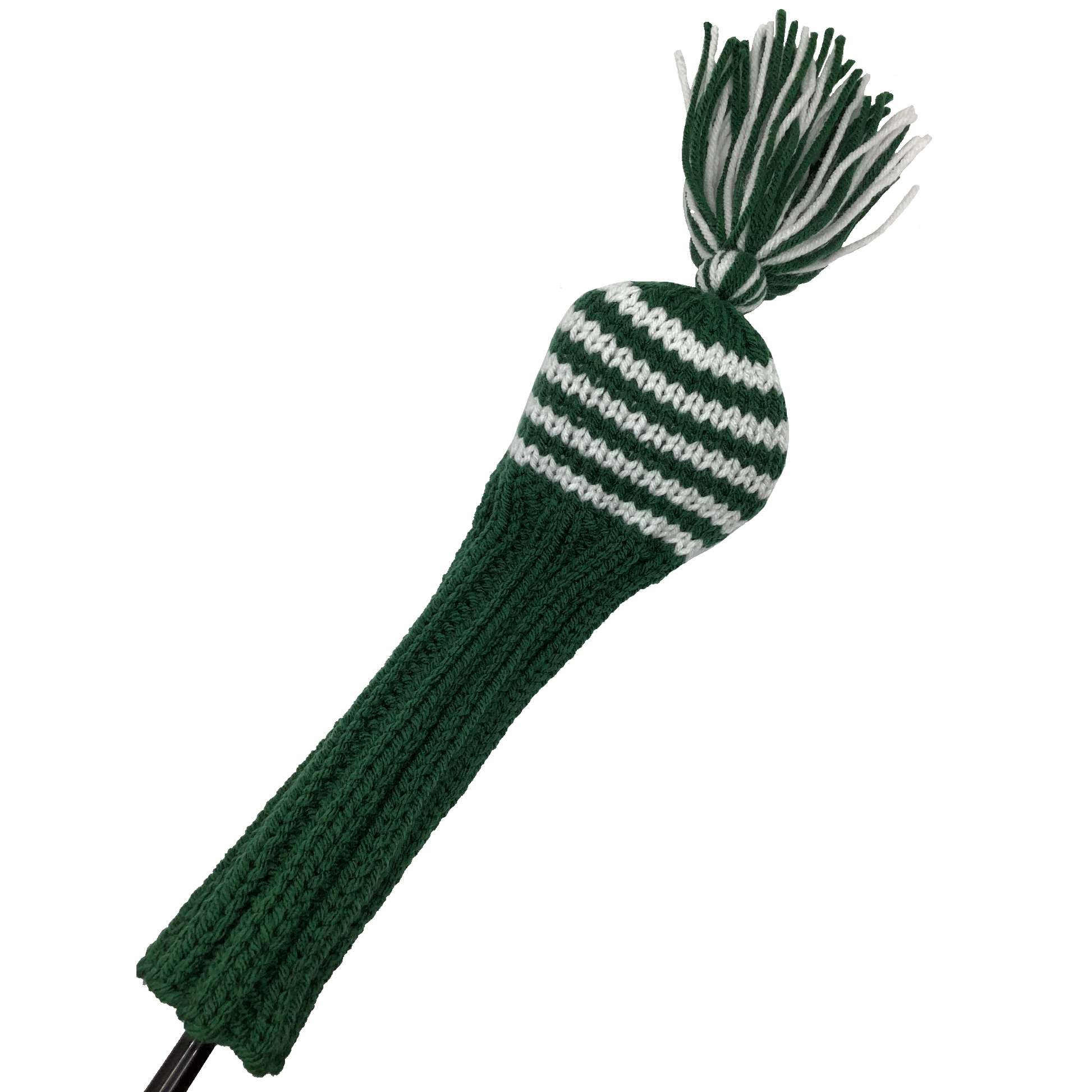 Classic style fairway wood headcover in forest green with five white stripes and an 8" shaft portion. Choose topper style: none, tassel or pom-pom.