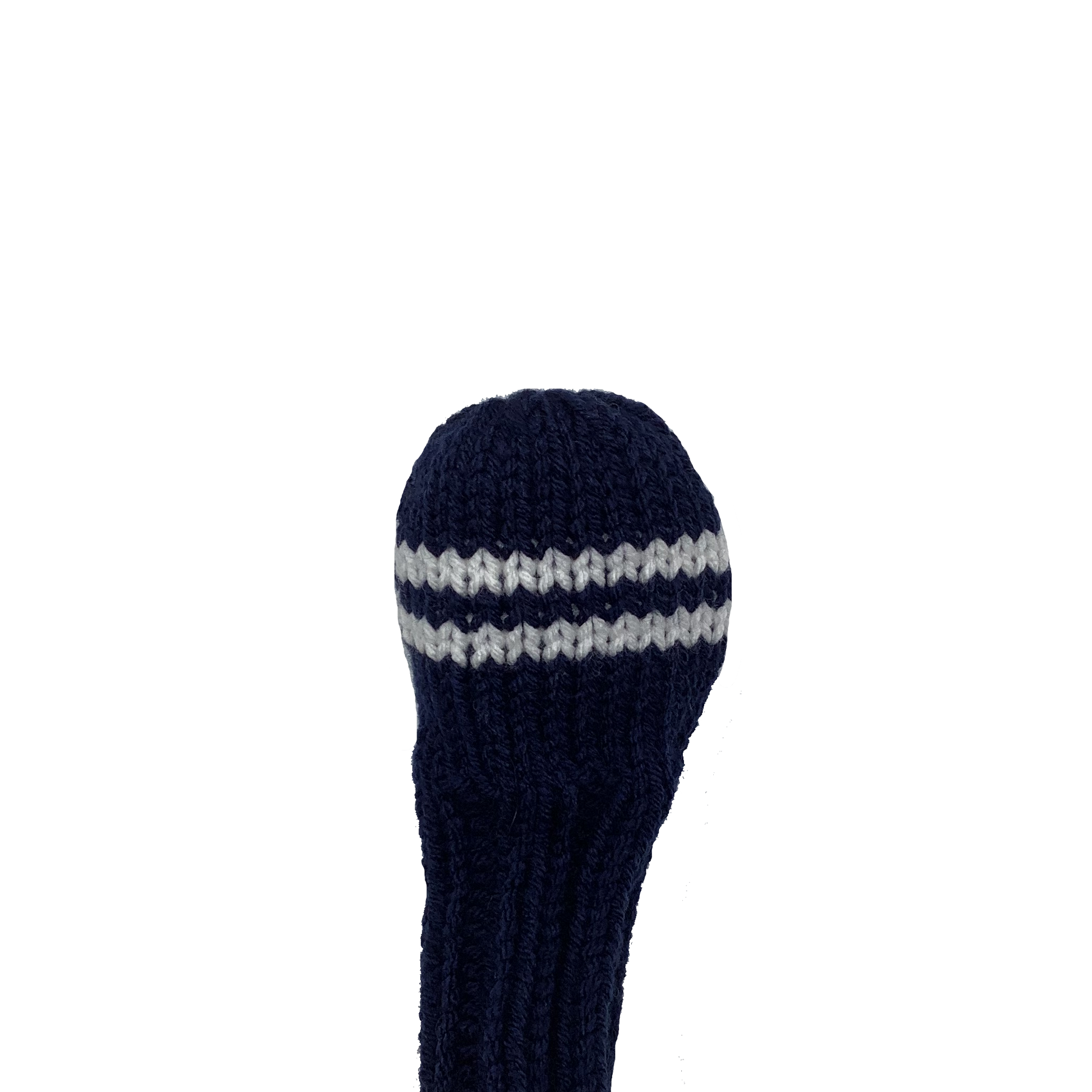 Classic style hybrid headcover in navy blue with two white stripes and a 6" shaft portion. Choose topper style: none, tassel or pom-pom.