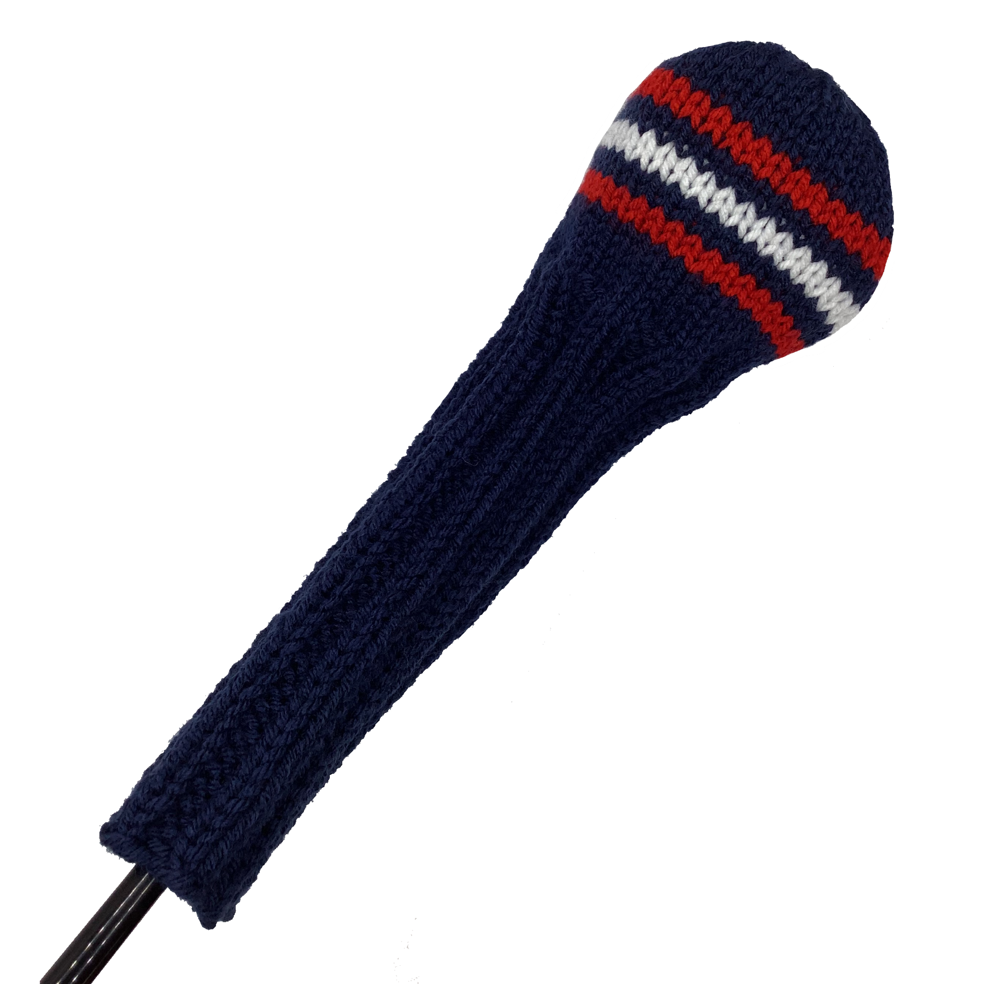 Classic style fairway wood headcover in navy blue with three stripes in red and white and an 8" shaft portion. Choose topper style: none, tassel or pom-pom.