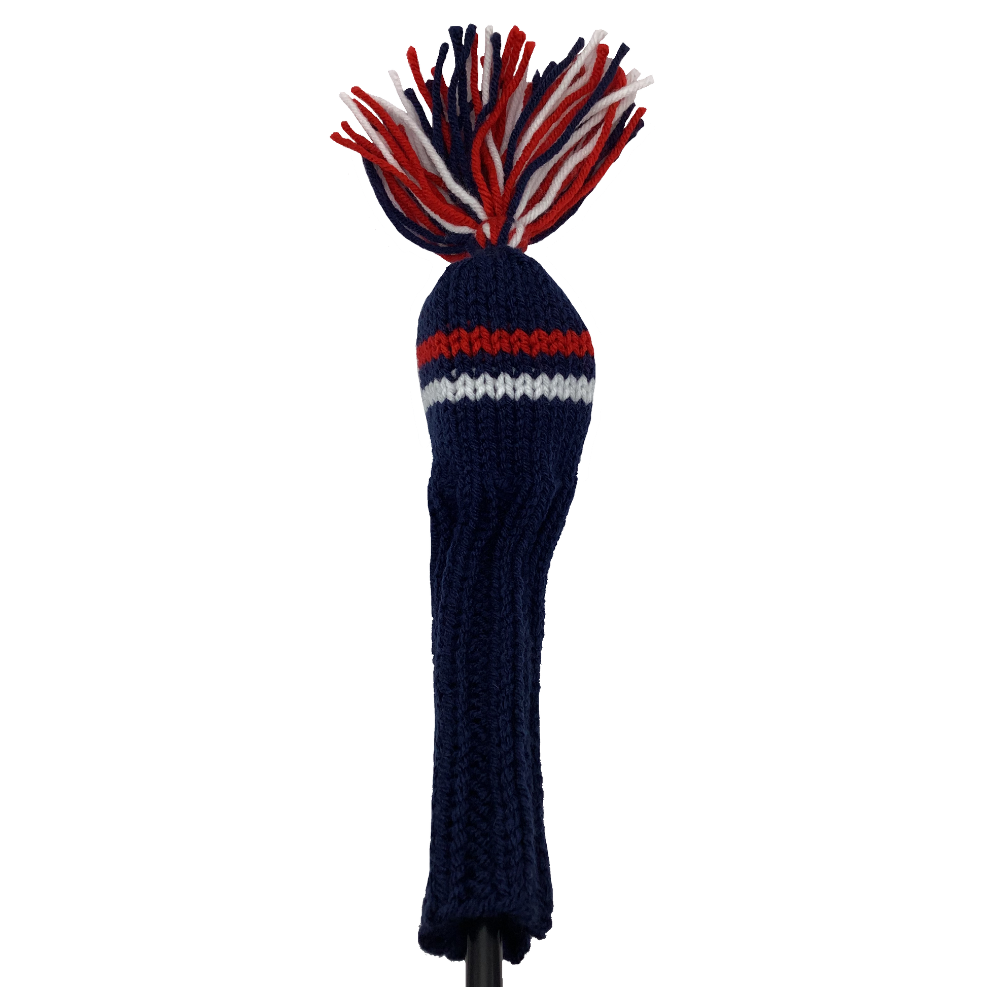Classic style hybrid headcover in navy blue with two stripes in alternating red and white and a 6" shaft portion. Choose topper style: none, tassel or pom-pom.